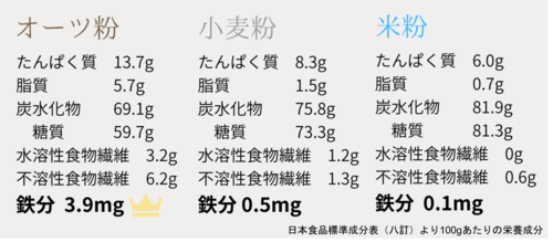 さらに、オートミールは100gあたり9.4gの食物繊維(小麦粉は2.5g、米粉は0.6g)を含むため、お通じが気になる方や野菜が不足している方にもうれしい食材です!